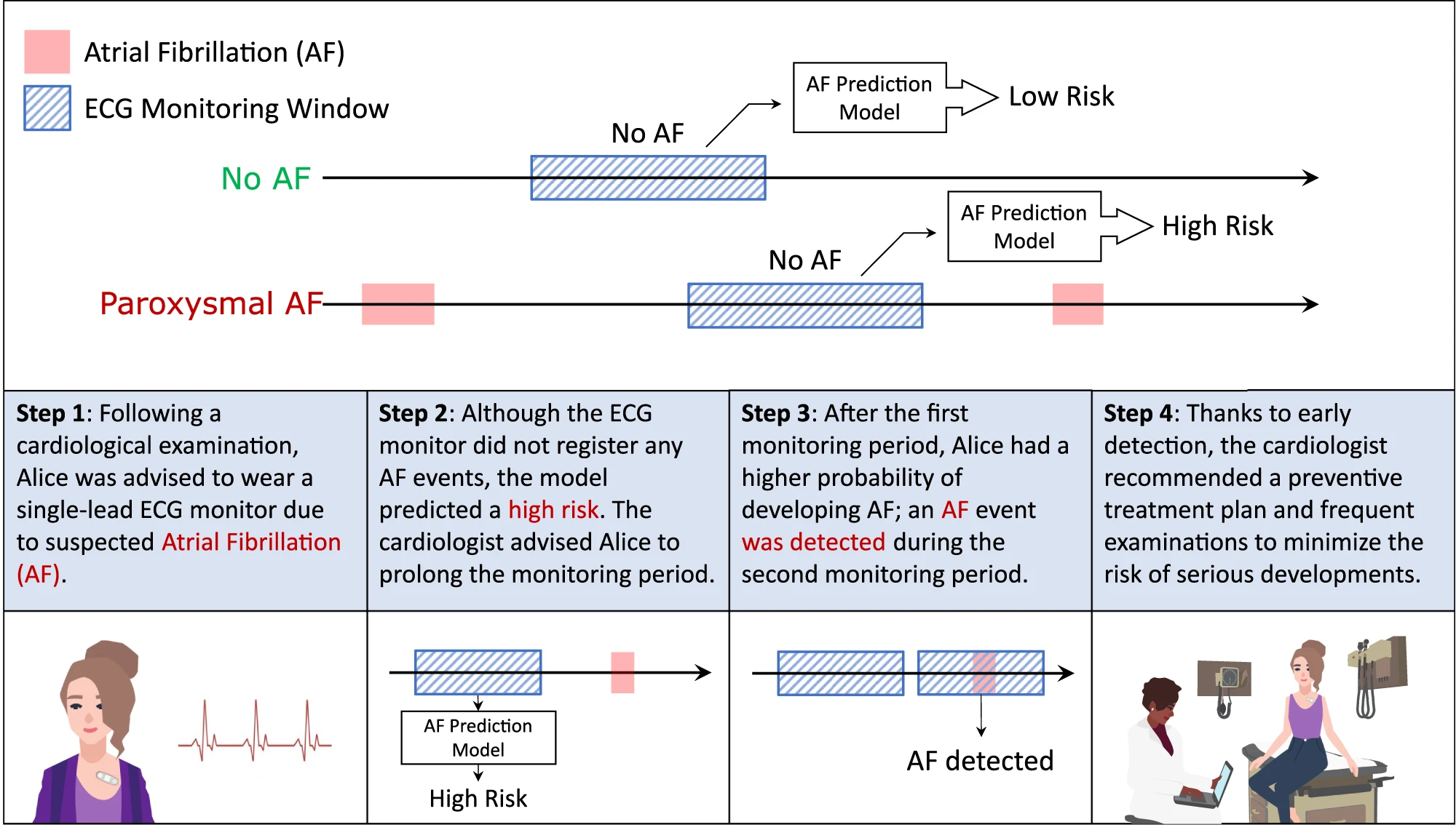 This study demonstrates the feasibility of predicting future AF episodes using deep learning and a single-lead ECG obtained from a chest patch. DL analysis of the ECG morphology significantly improved prediction accuracy compared to traditional features like demographics and heart rate variability. Longer monitoring periods further enhanced prediction, suggesting the presence of dynamic AF indicators not always captured in short recordings. Similar to other recent work (previously reviewed on this blog), this novel approach holds promise for identifying individuals who would benefit most from screening with extended ECG monitoring. Overall, the findings pave the way for a novel digital strategy of AF risk assessment and personalized monitoring, potentially leading to improved clinical outcomes (see the case study below, provided by authors of the study). Further validation in prospective studies and integration with additional clinical data are necessary before widespread clinical implementation.